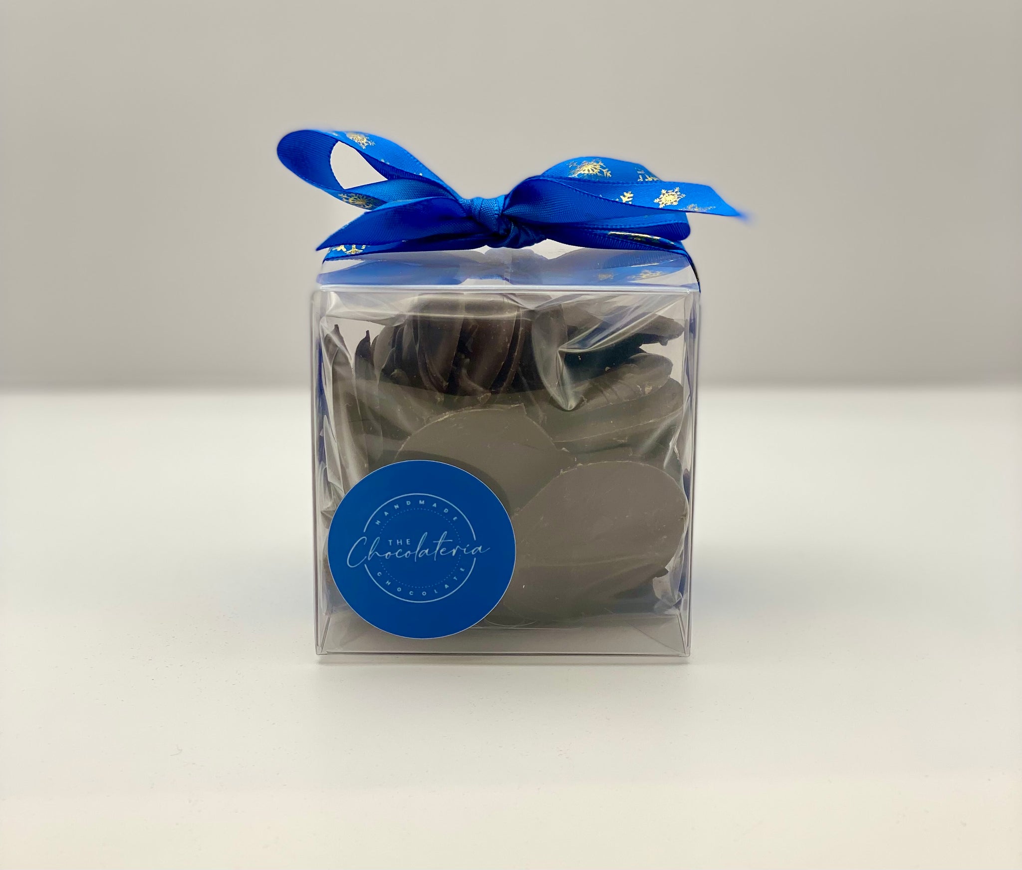 Hand-piped discs of 33.6% milk or 54% dark chocolate infused with sweet and tangy orange. 150g.