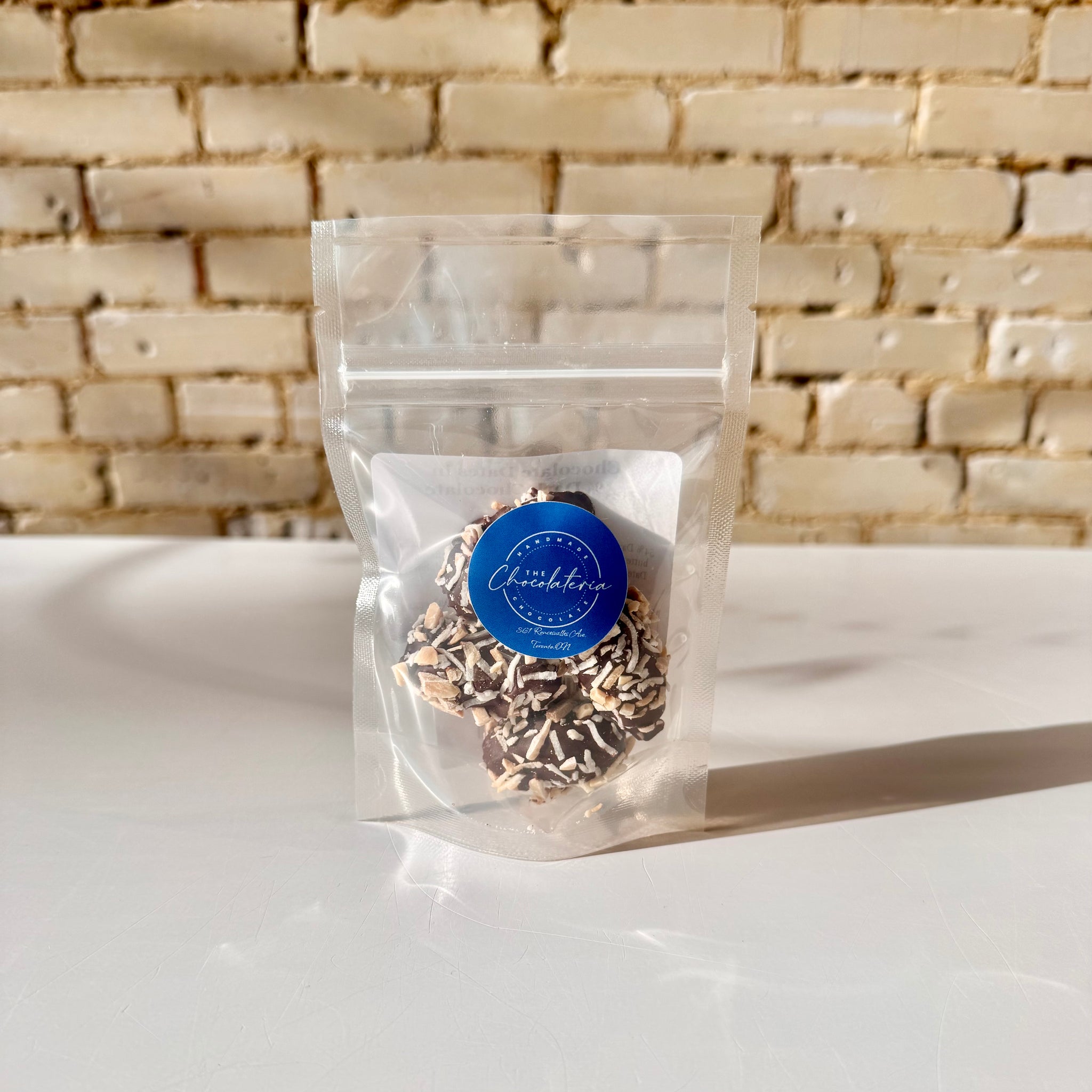 Chocolate-covered dates with almonds and toasted coconut. Available in milk or dark chocolate. 4 dates per bag.